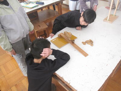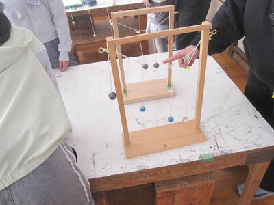 ふりこを使った装置は様々な物があり、実際に見たり動かしたりして、ふりこのおもしろさを体験しました。特にふりこをつかって動く木のおもちゃが人気でした。日立理科クラブの皆さん、たくさんの準備や実験、お話をしていただき、ありがとうございました。