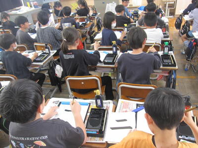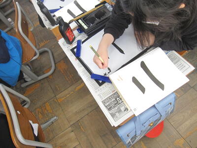 3年生 毛筆にチャレンジ! 投稿: 承認者 (04/16) カテゴリー: 授業の様子 4/15 3年生の書写では、毛筆を使った学習が始まりました。今日は毛筆を使って「二」の文字を書く練習をしました。みんな真剣な表情で、筆遣いに気を付けながら集中して書いていました。